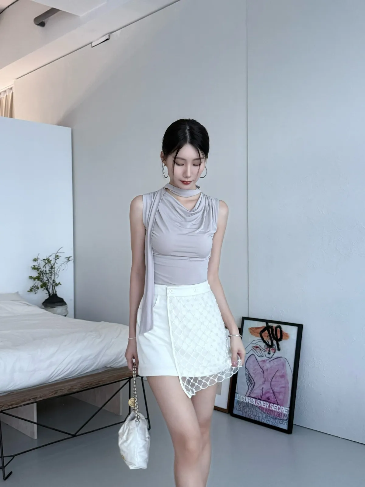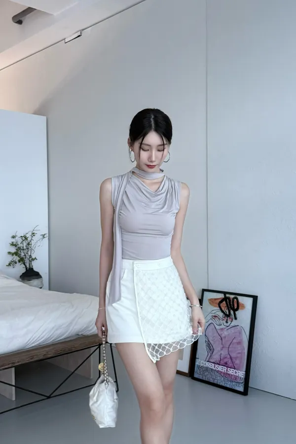 這款短裙巧妙地將硬挺的西裝面料與精緻的透膚網紗結合。最令人驚喜的設計在於其「可拆卸式網紗」,讓妳能隨心所欲地在俐落率性的「基礎短裙」與浪漫柔美的「層次網紗裙」之間切換。