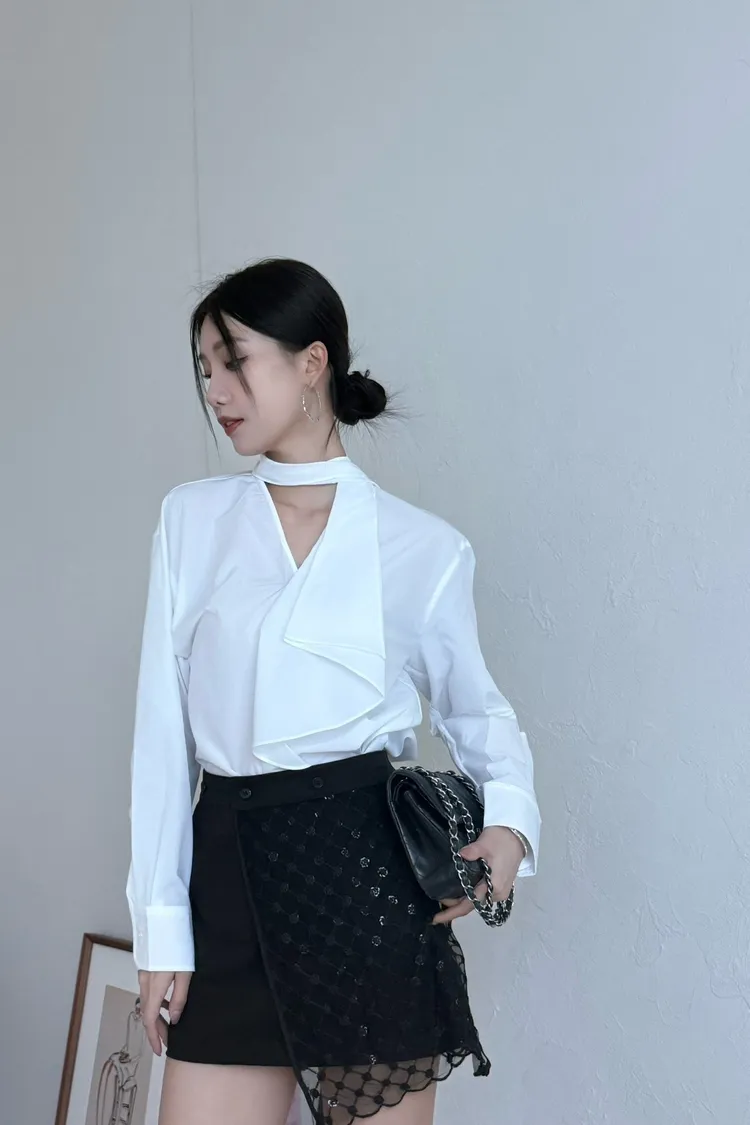 不對稱剪裁: 獨特的斜向拼接設計,打破黑裙的沉悶,視覺上更顯腿長。