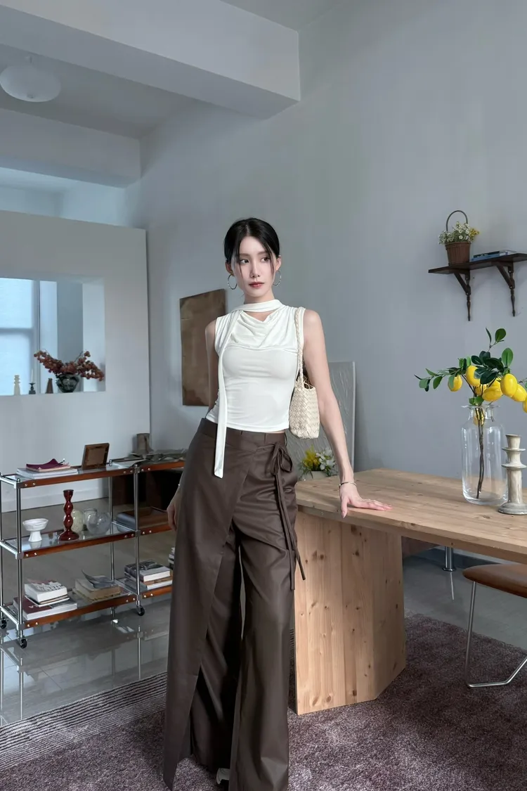 想要擁有豐富的層次感卻擔心下半身顯得厚重?這款「假兩件綁裙長褲」是妳的完美解答。設計上巧妙地在俐落的直筒寬褲外疊加了一層不對稱圍裙片**,配合側邊可調式綁帶,不僅能完美修飾臀部與大腿線條,更能隨著走動展現飄逸的立體律動感。